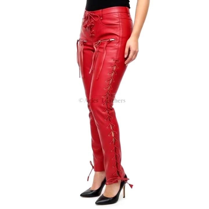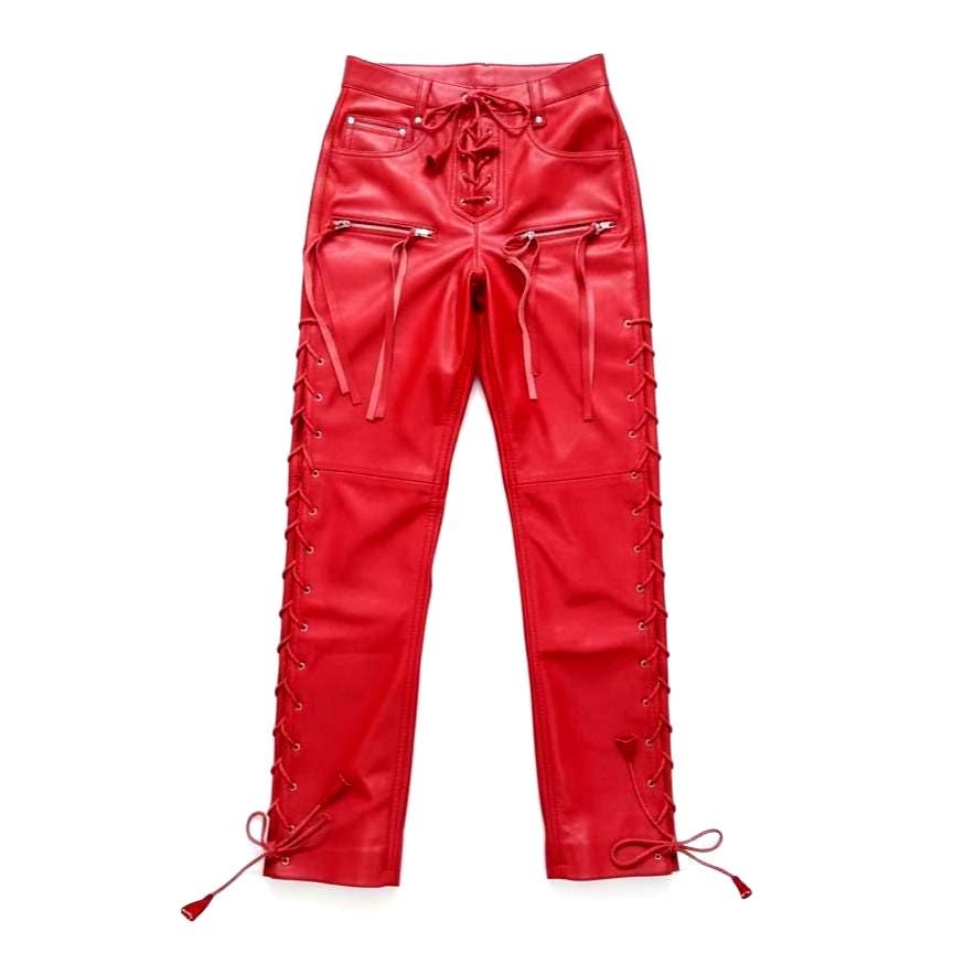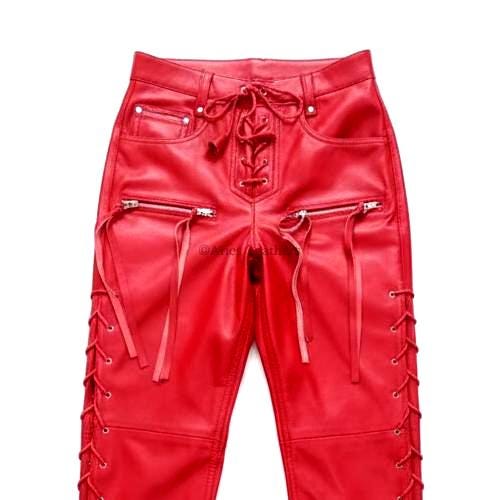 Turn heads with these bold red lace-up leather pants — the ultimate statement piece for your wardrobe 🔥. Crafted from premium genuine leather, these high-waisted pants feature lace-up detailing along the sides and front for a perfect edgy, figure-flattering fit. Ideal for concerts, nights out, festivals, or fashion-forward streetwear looks, they combine luxury craftsmanship with fierce style. ✨ Product Details: 💎 Material: 100% Genuine Leather 👖 Fit: Slim, high-waisted design with lace-up sides and front closure 🎸 Style: Edgy biker-inspired with zipper pockets and corset-style details 🌹 Color: Vibrant red for a bold, confident statement (Available in all color) 🧷 Occasion: Perfect for night outs, music festivals, photoshoots, or runway-inspired outfits 🧼 Care: Dry Clean Only Add these red lace-up leather pants to your collection for an instantly iconic, rebellious look that exudes power, confidence, and individuality ❤️