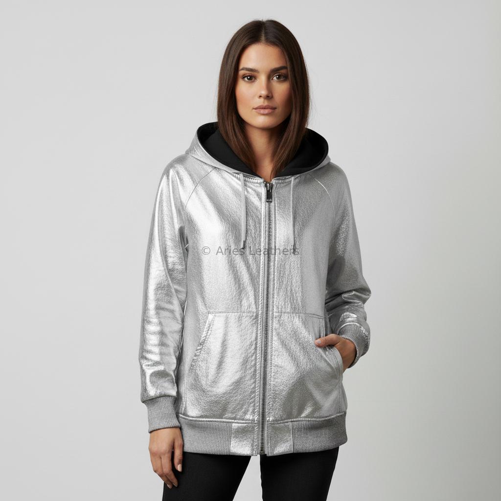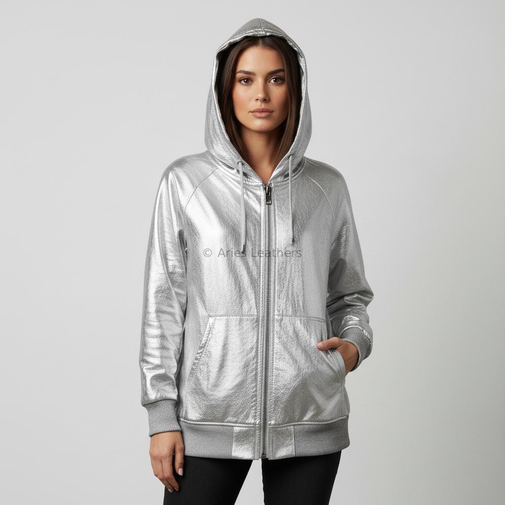 π MAKE A BOLD STATEMENT WITH THIS STUNNING SILVER METALLIC LEATHER HOODIE π