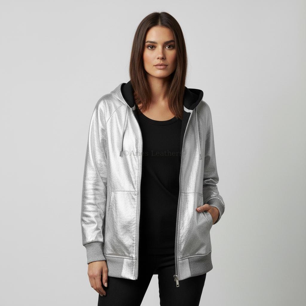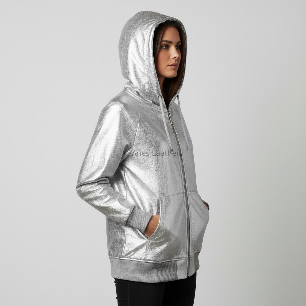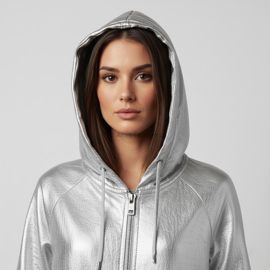 This unique silver metallic leather hoodie is handcrafted in small batches to ensure exceptional quality. Due to high demand and the time-intensive creation process, we often sell out quickly!