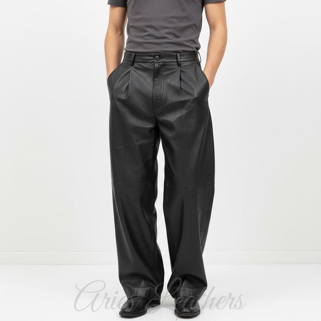 ► KEY FEATURES: Material: 100% Genuine Soft Lambskin Leather, known for its exceptional durability and classic texture. Fit: A modern, relaxed baggy fit with a wide leg for ultimate comfort and style. Pockets: Features multiple, functional pockets on the thighs, in addition to standard front and back pockets. Construction: Button Closure. Handmade: Expertly stitched for a premium finish, ready for everyday wear and tear.