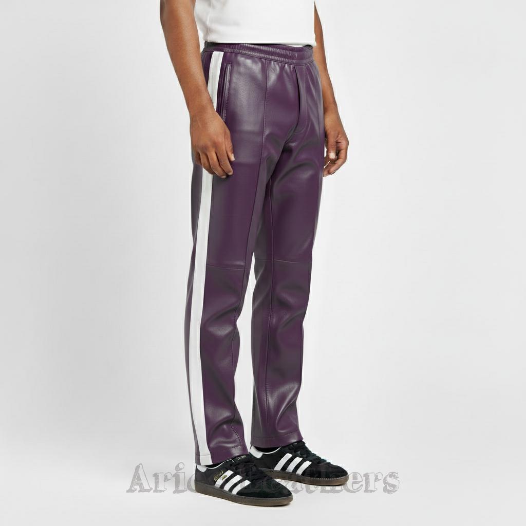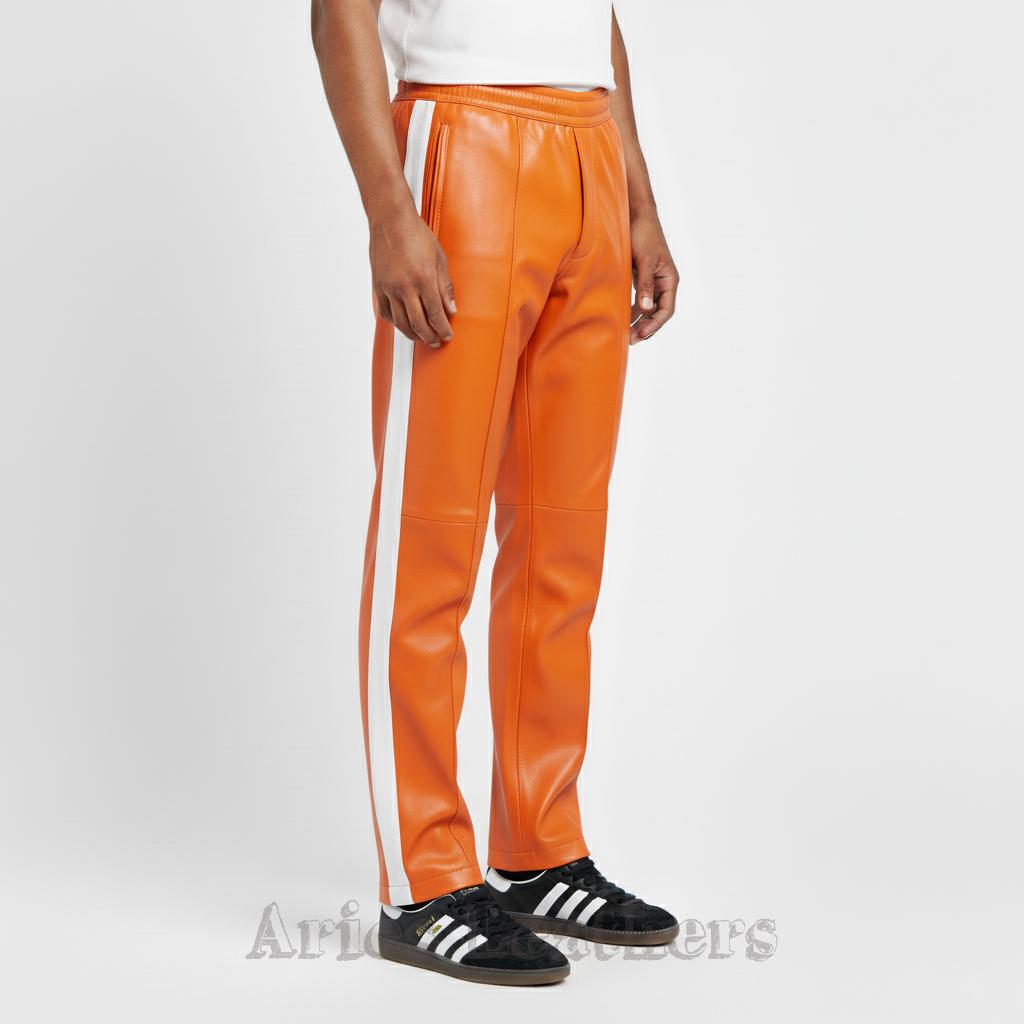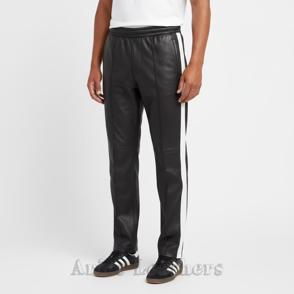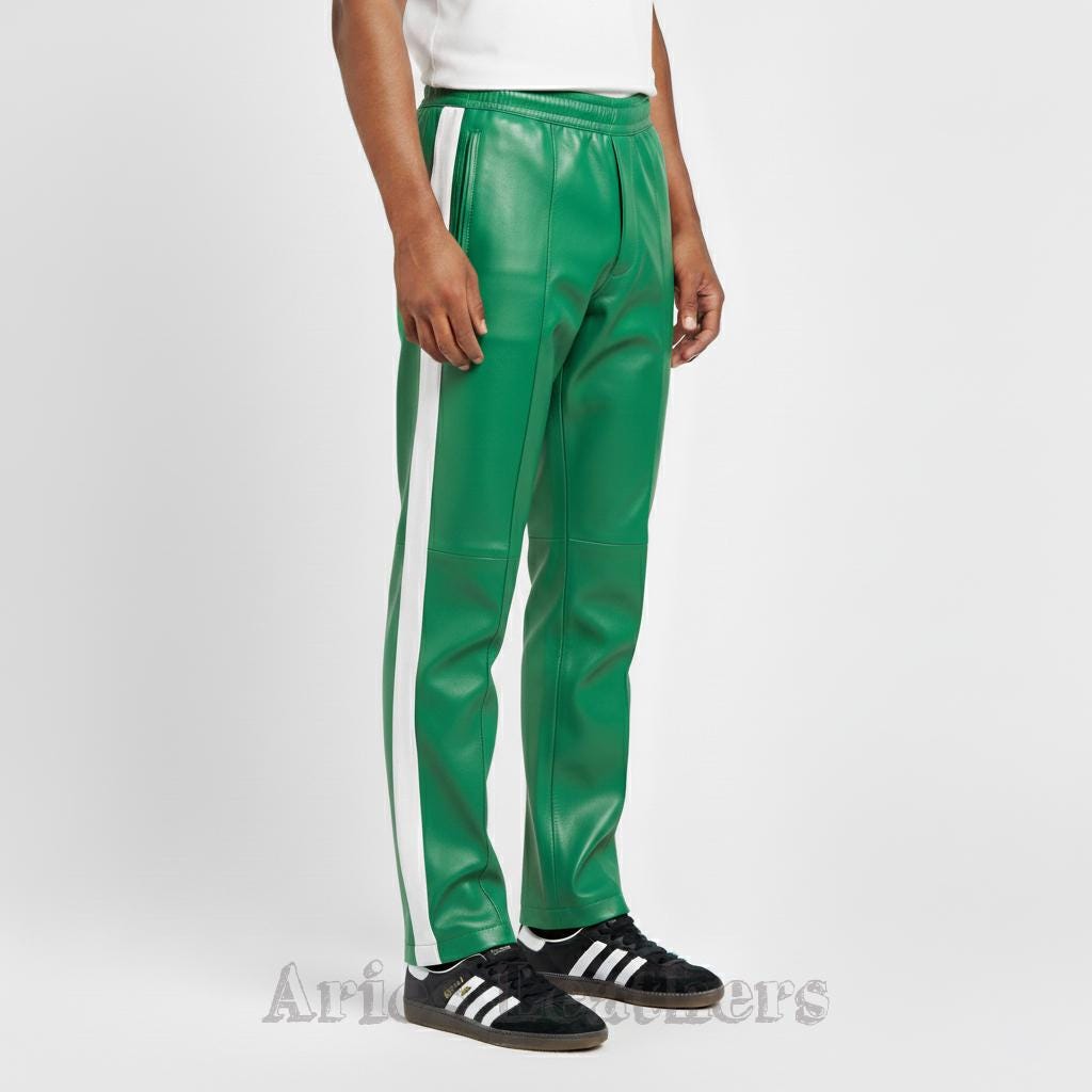 These men’s leather track pants bring that retro athletic swagger to the moment, blending a sleek lambskin leather finish with bold color options that pop instantly. Made for the guy who loves a little edge in his wardrobe, these pants hit the sweet spot between sporty and stylish — perfect for nights out, streetwear fits, or leveling up your everyday vibe. The side stripe keeps the look classic, while the vibrant palette lets you choose the energy you want to walk in. Slip into them and you’ll feel that confident, future-facing drip — no pretending needed.