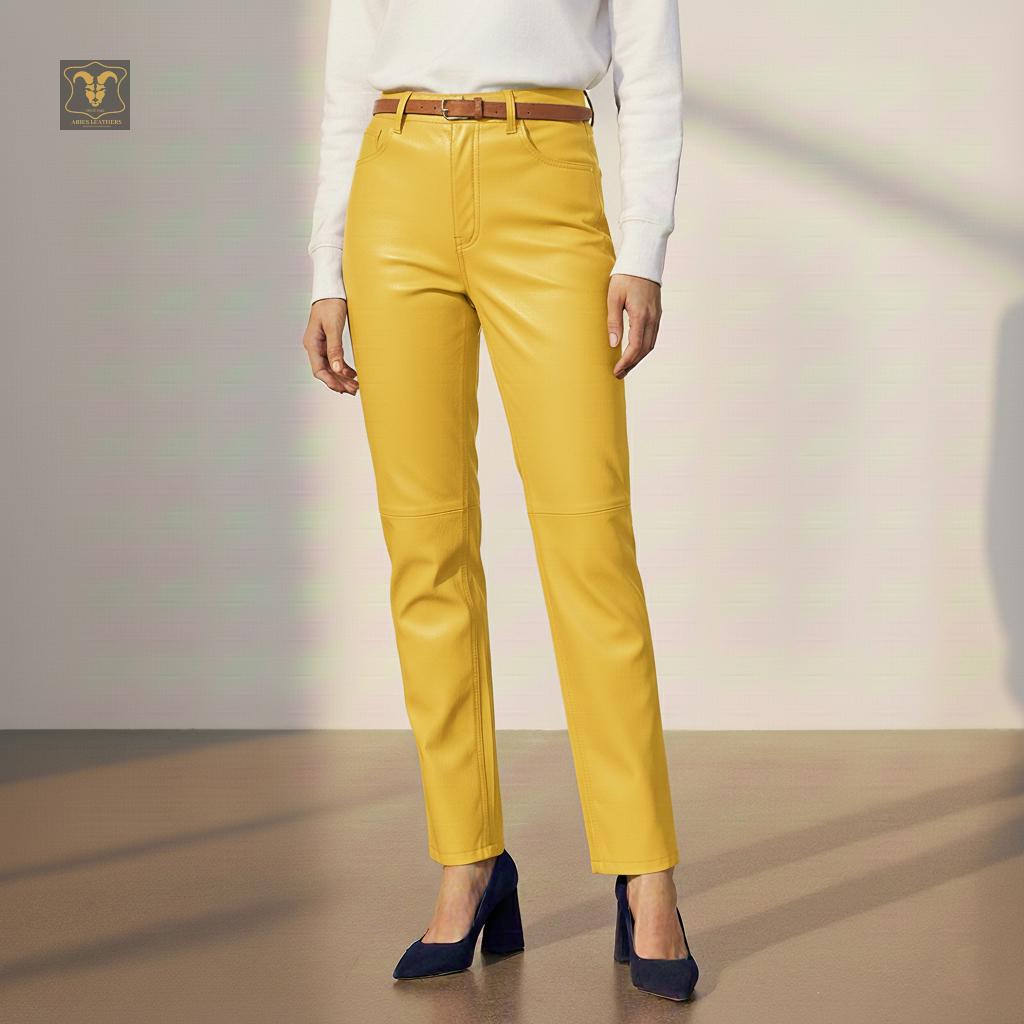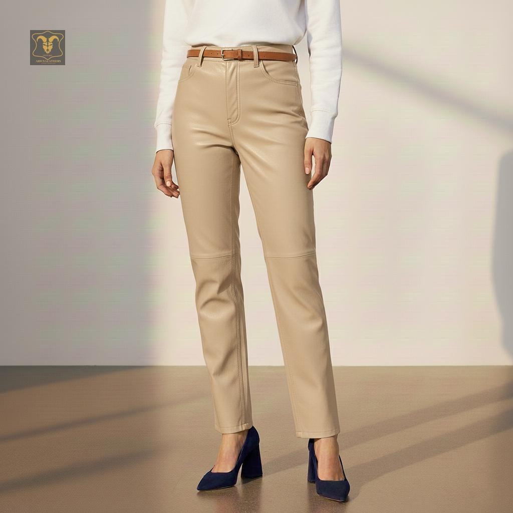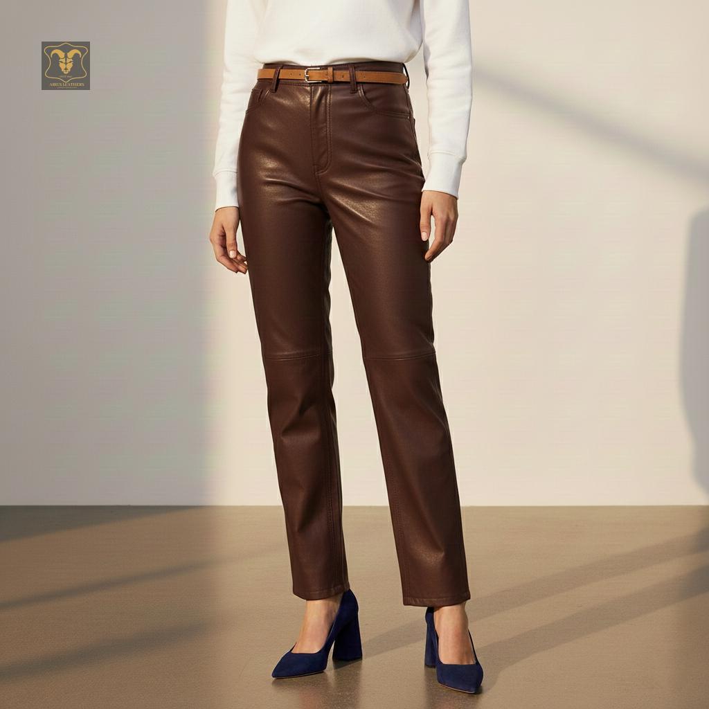 These high-waisted leather pants for women are the perfect blend of chic style and everyday confidence, crafted from smooth genuine leather for a luxurious look and feel. Designed with a straight-leg silhouette, these trousers elevate any outfit—whether you're dressing up for a night out or creating a polished, minimalist daytime look. Soft on the inside and sleek on the outside, they’re made for women who love timeless wardrobe staples that last.
