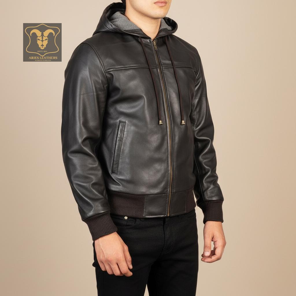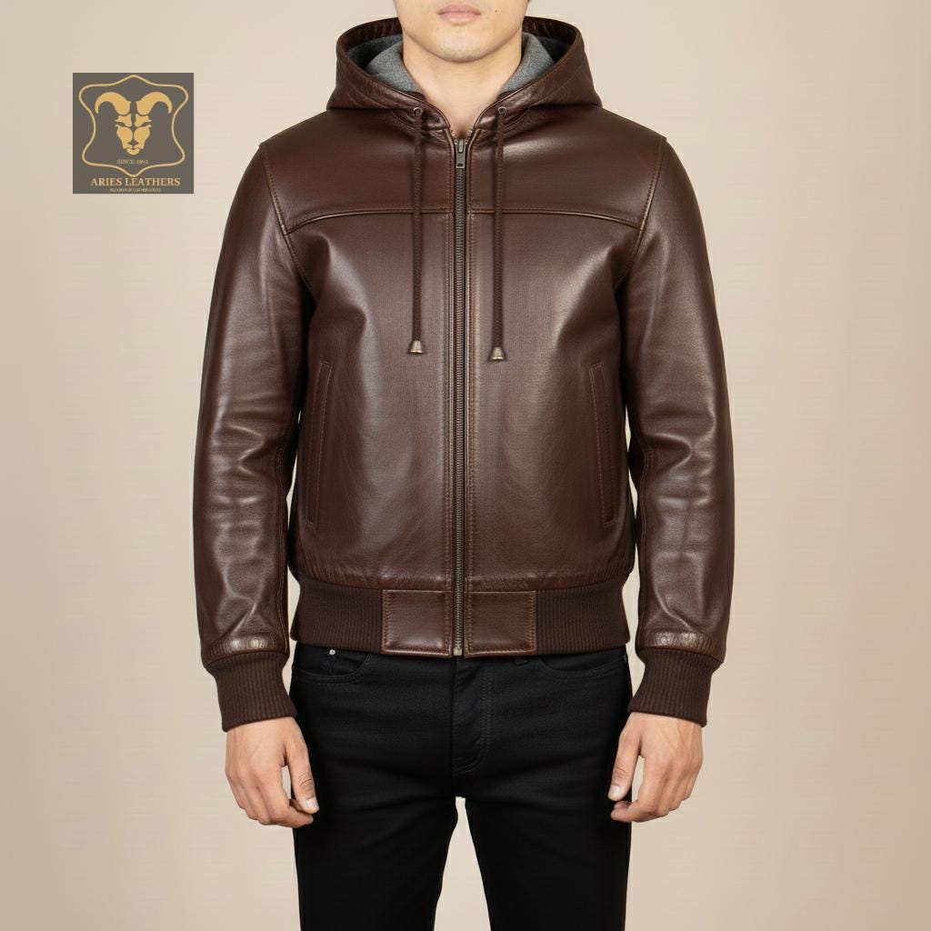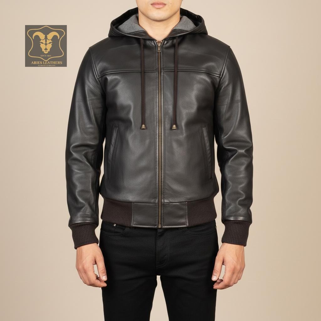 Hey there! Searching for the ultimate blend of style and comfort? Our Leather Bomber Jacket with Hood is a must-have for the modern man. This Mens Leather Hoodie is crafted from genuine leather, ensuring a sleek look and durable wear. Perfect for winter, this warm hoodie men can't resist combines the edgy vibe of a biker hoodie with the luxurious feel of a real leather hoodie. Trust me, whether you're hitting the streets or heading to a night out, this black leather hoodie will have you looking sharp and staying cozy.