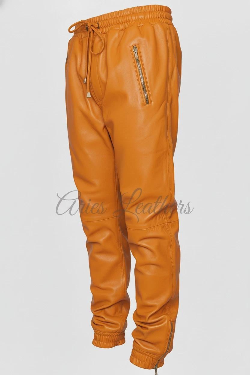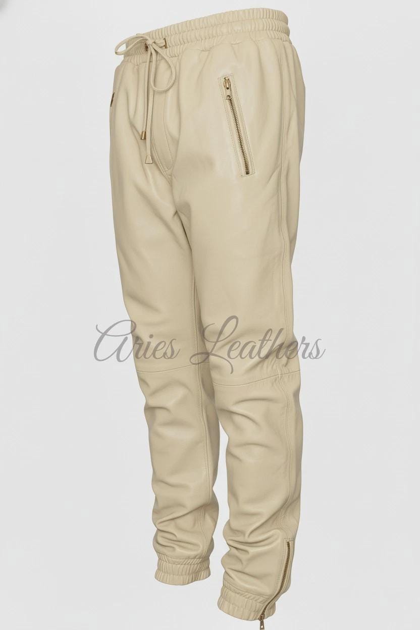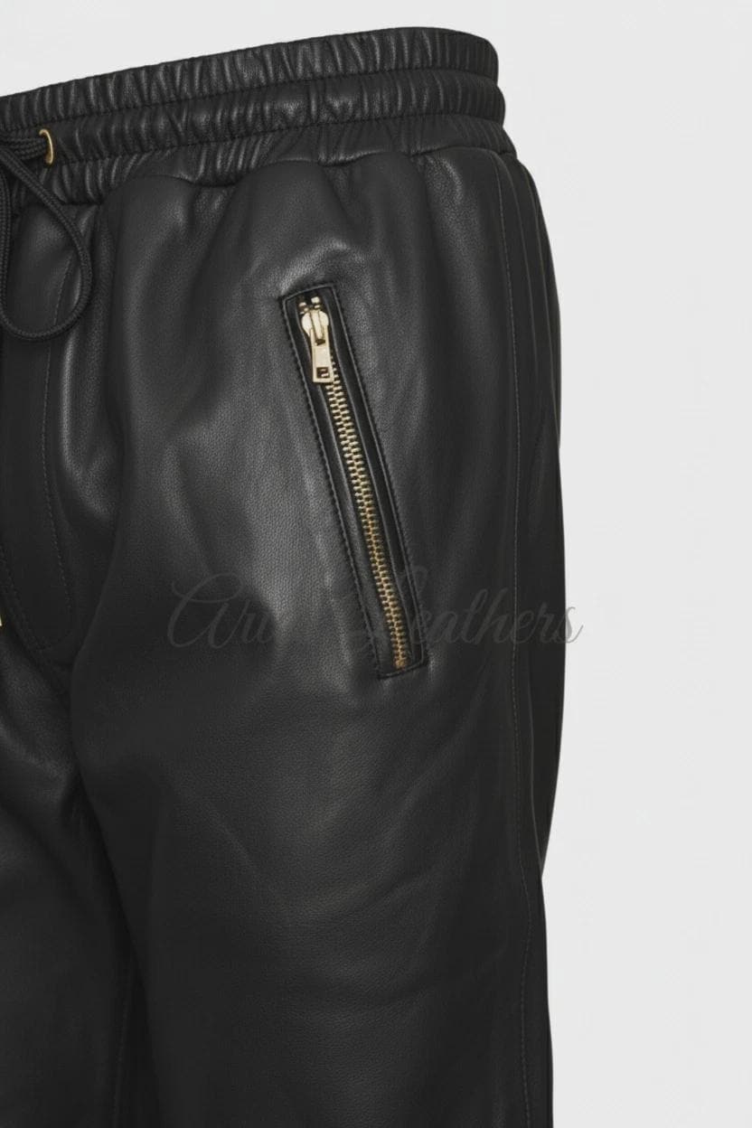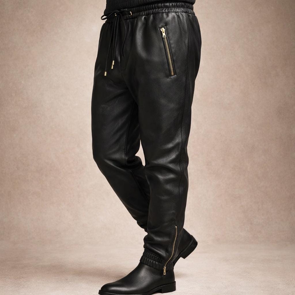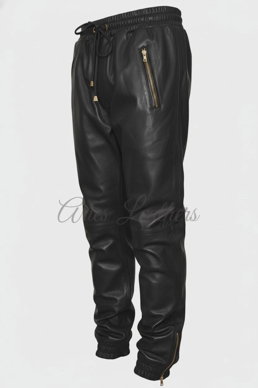 Men’s Genuine Lambskin Leather Joggers – Slim Fit Track Style Pants with Gold Zipper