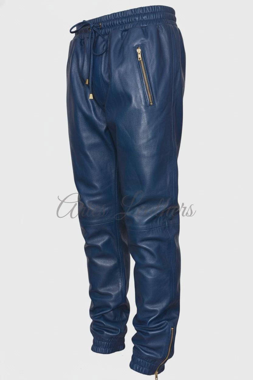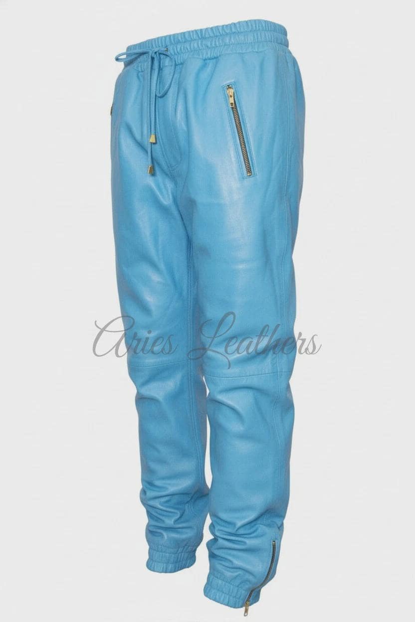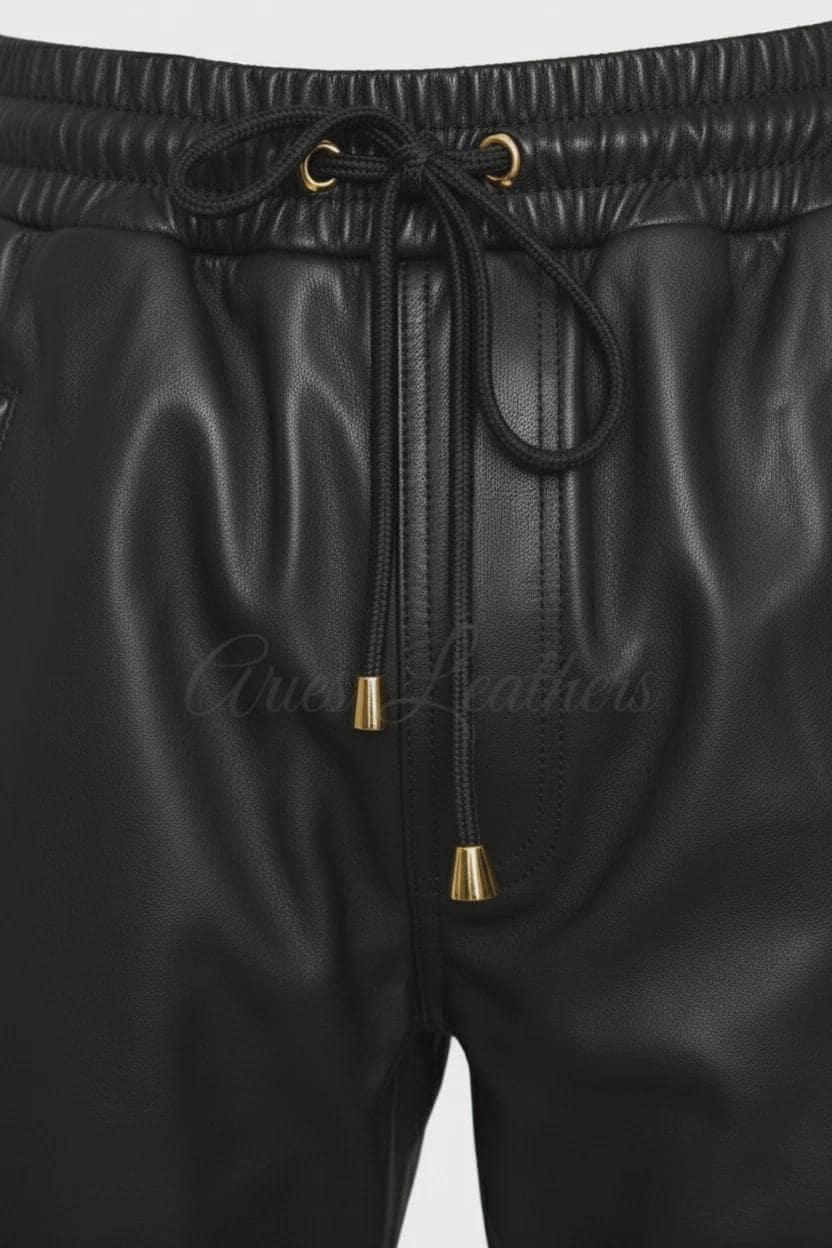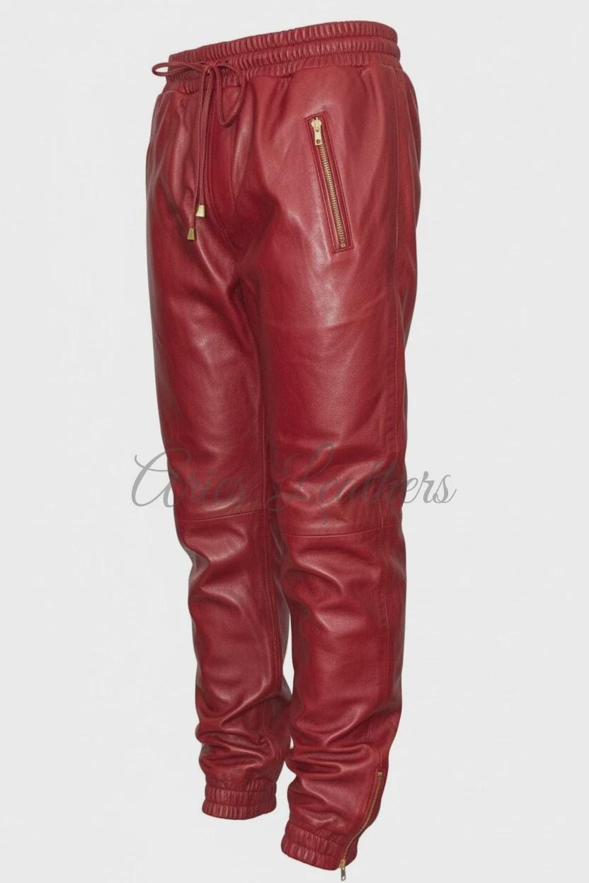 Men’s Genuine Lambskin Leather Joggers – Slim Fit Track Style Pants with Gold Zipper