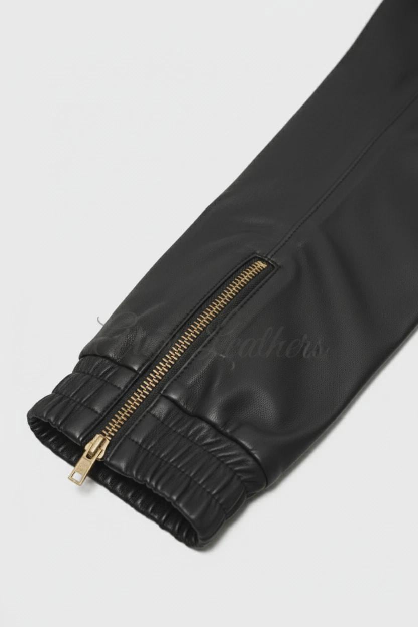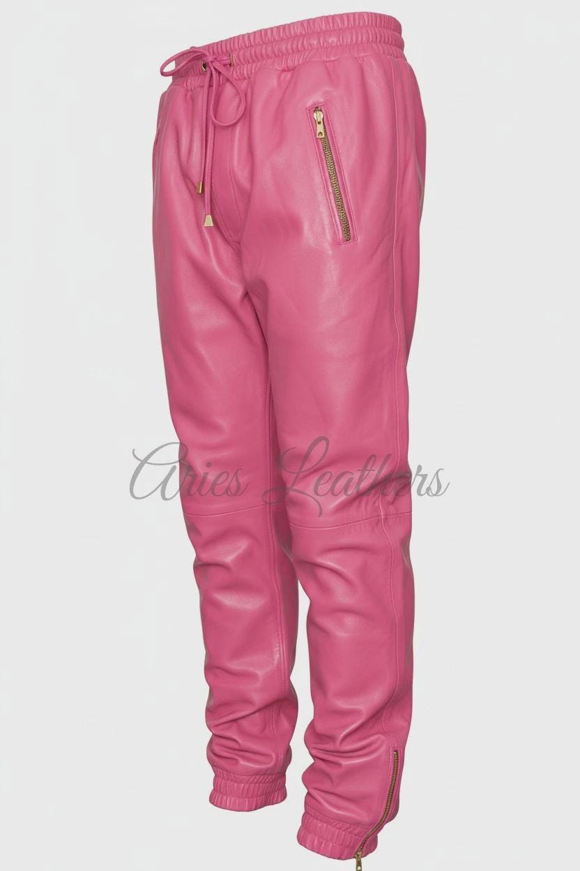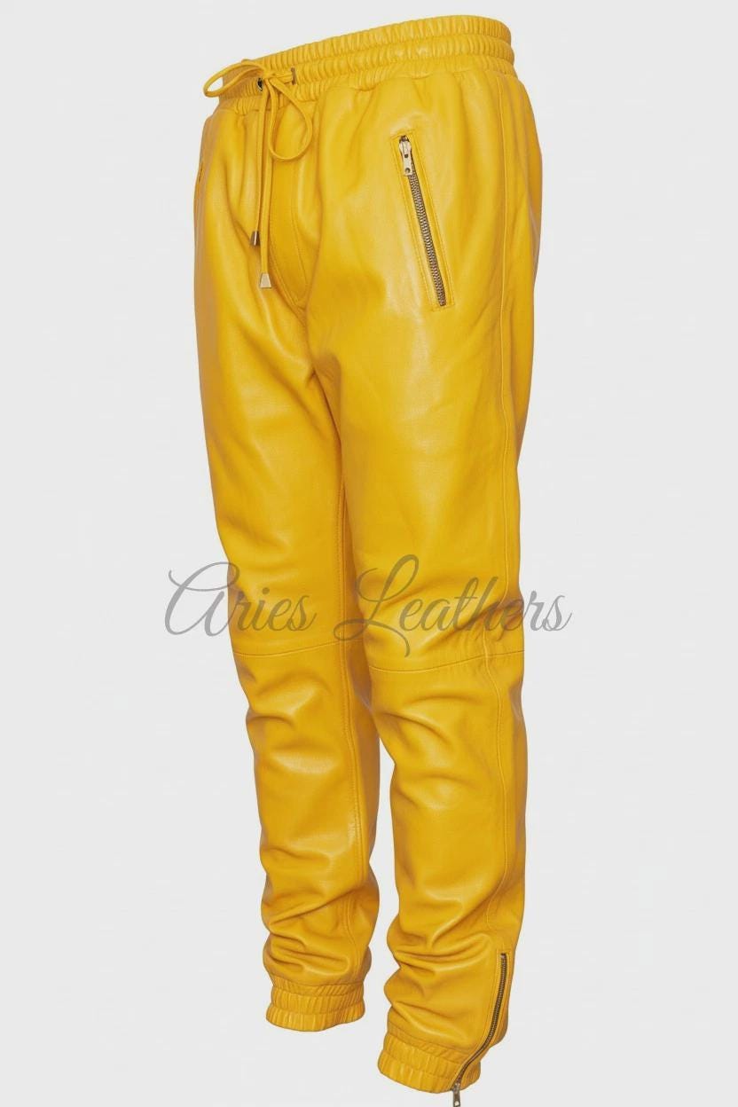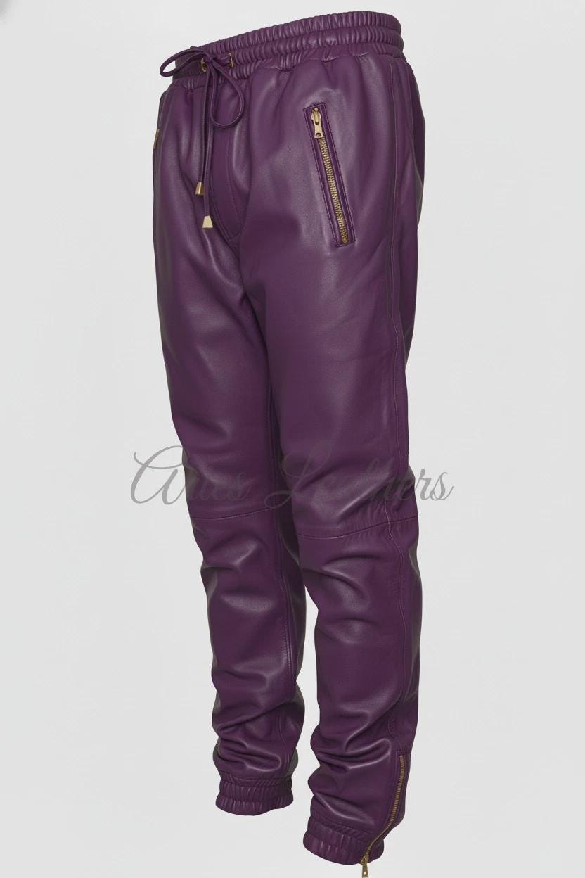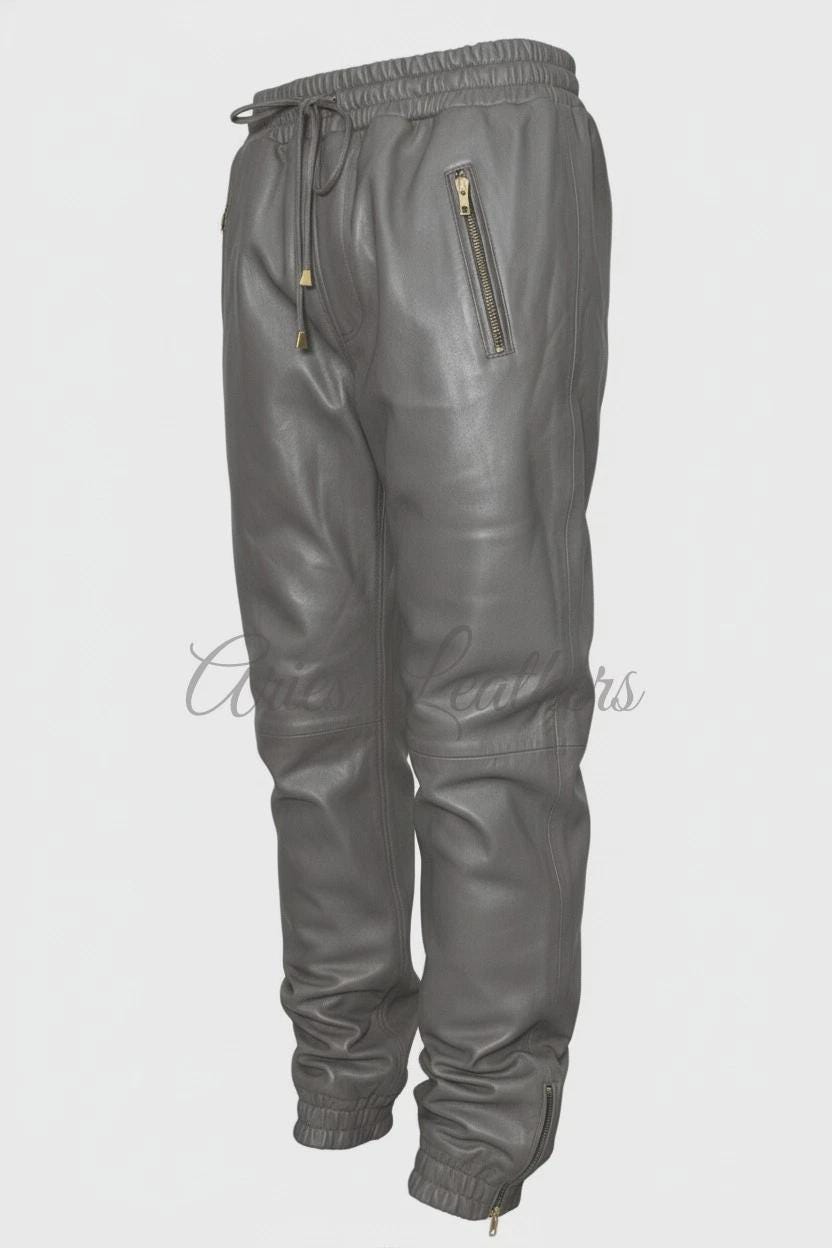 Men’s Genuine Lambskin Leather Joggers – Slim Fit Track Style Pants with Gold Zipper