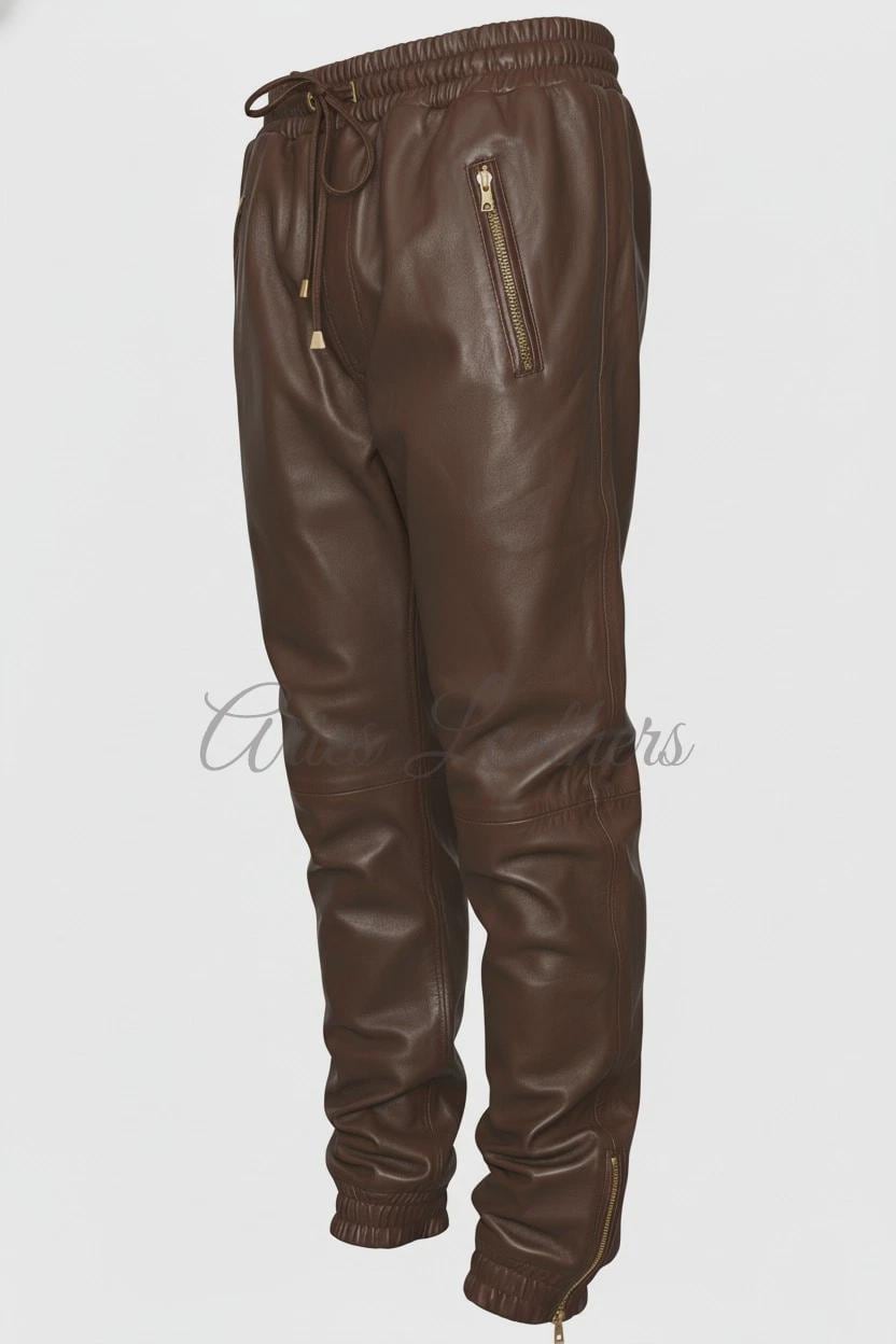 Upgrade your wardrobe with these handcrafted brown lambskin leather joggers designed for modern men who value comfort, structure, and premium materials.