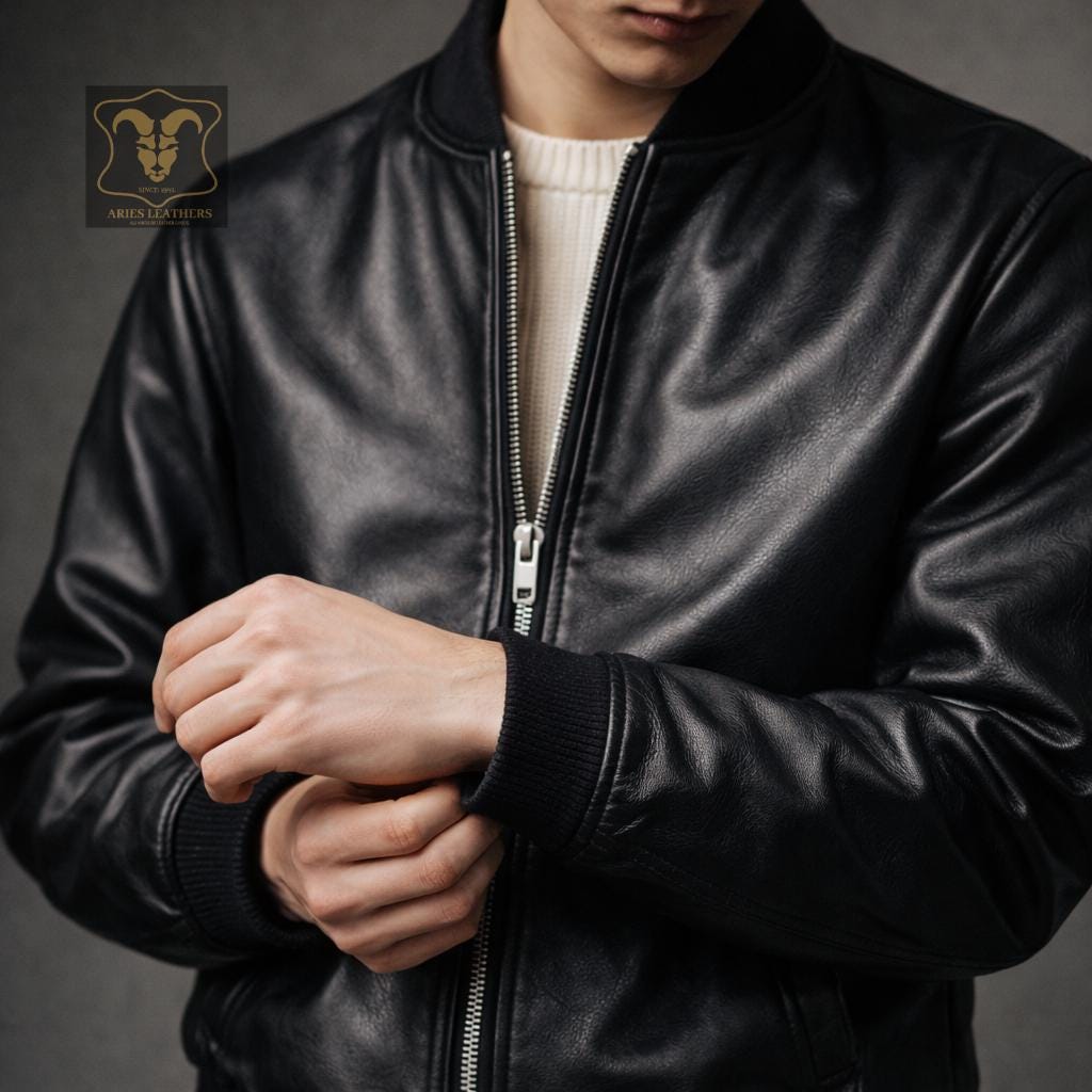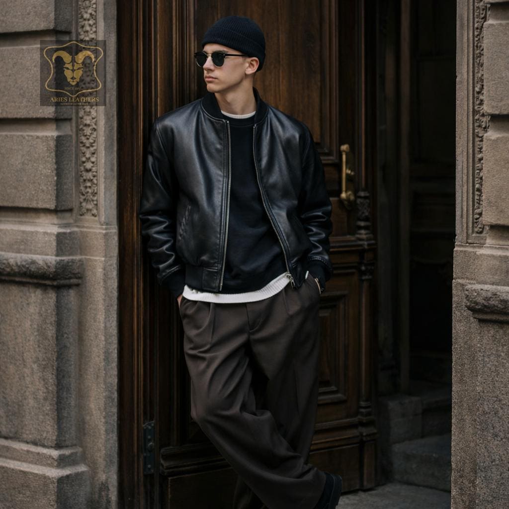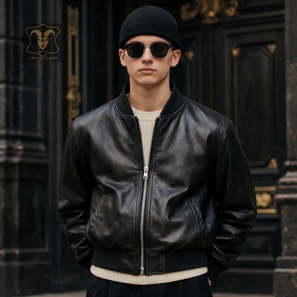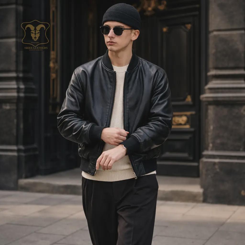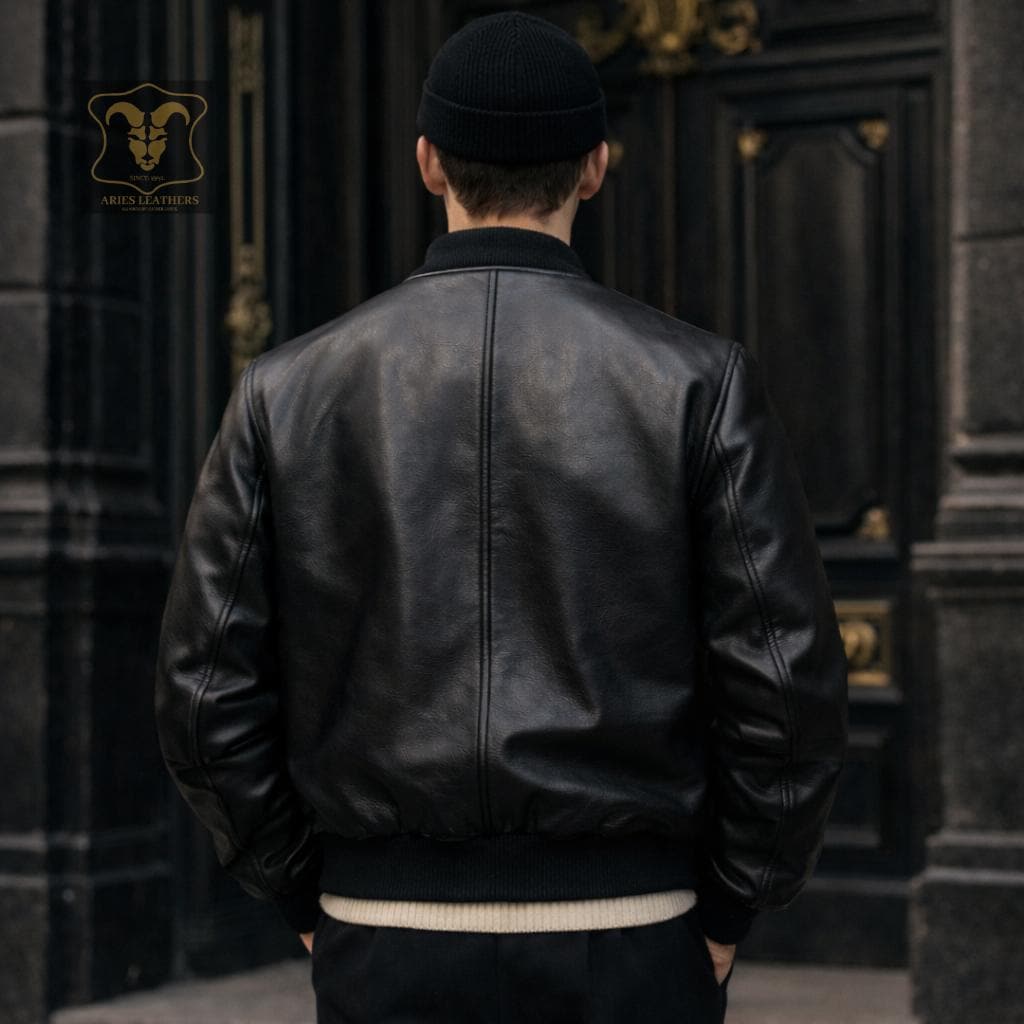 Men's Vintage Black Leather Bomber Jacket Genuine Lambskin 90s Retro Streetwear Casual Lightweight Coat